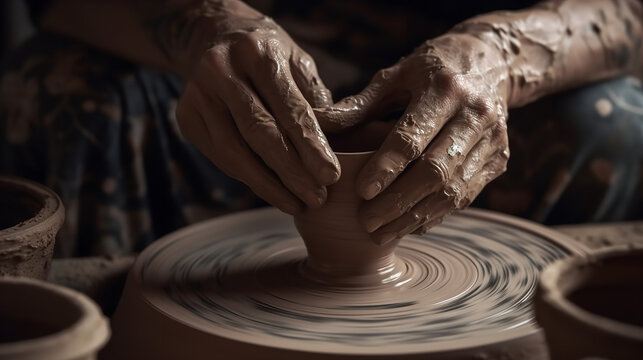 A skilled potter uses their hands to shape a piece of clay on a pottery wheel, capturing the artistry and dedication involved in crafting ceramic objects in a workshop studio.