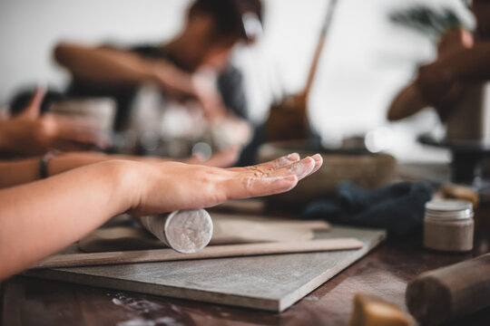 View of female hands works with clay makes future ceramic plate, ceramic artist makes classes of hand building in modern pottery workshop, creative people handcrafted design