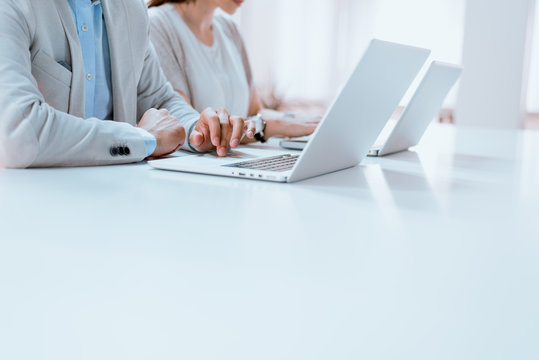 working on laptop computer, closeup of hands of business man, business banner background with copyspace