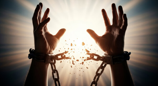 Man breaking free from chains with upward reaching hands. Concept of freedom, liberation, and overcoming adversity. Day for the Abolition of Slavery
