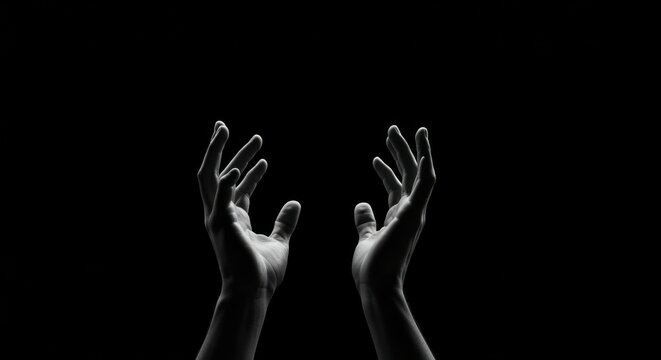 Two hands reaching upwards against a stark black background, conveying a sense of yearning or supplication