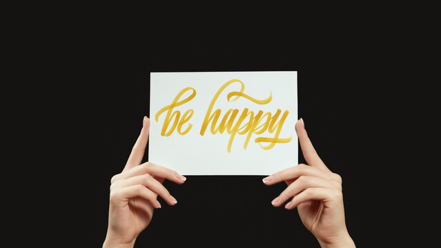 Be happy motivation slogan. Positive attitude. Female hands showing supportive banner with encouraging text isolated on dark black copy space background.