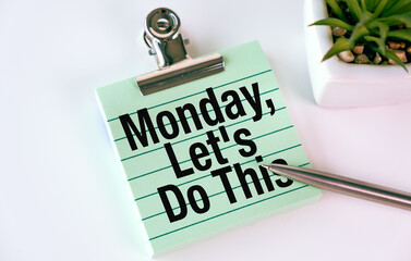 A green clipboard with the words Monday, Let's Do This written on it