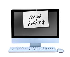 A hand written Gone Fishing sign is taped to a computer monitor showing that the business man or business woman worker is out on vacation or gone for the day and not working