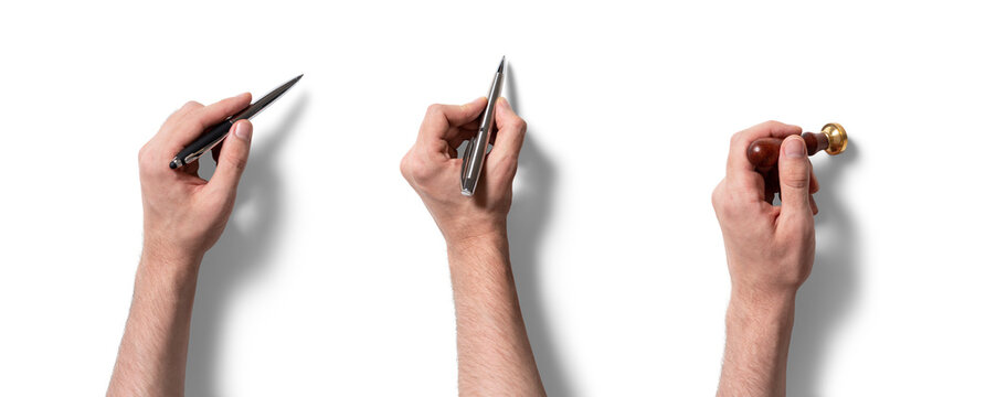 Three hands are shown holding a different writing instrument each, including a fountain pen, a ballpoint pen, and a wax seal stamp, inviting creativity and communication