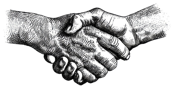 A cartoon-style handshake symbolizing agreement and financial partnership, with cash illustrated in the background.