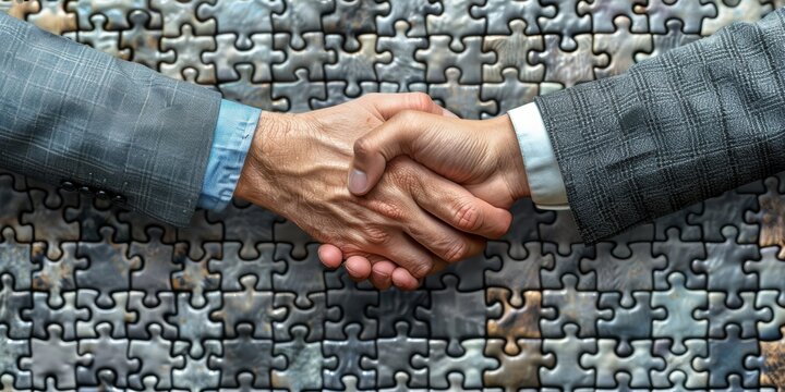 A symbolic representation of cooperation and successful partnerships through a handshake set against a background of interconnected puzzle pieces representing synergy and collaboration