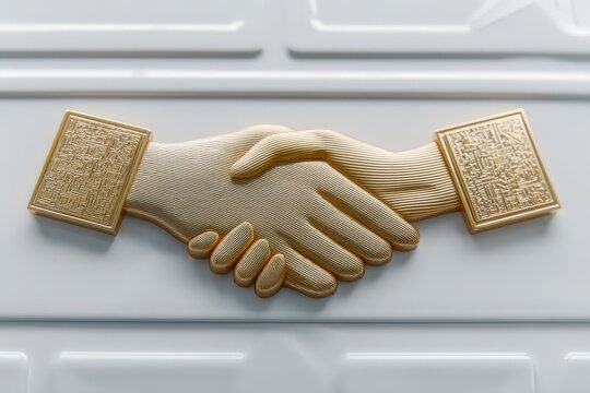 Digital Handshake: A futuristic and symbolic representation of partnership, collaboration, and agreement, depicted through two digital hands joining in a handshake against a vibrant background.