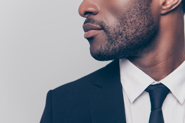 Cropped close up half-faced portrait of handsome serious stunning attractive sexy confident afro man wearing formal clothing outfit, isolated on gray background, copy-space