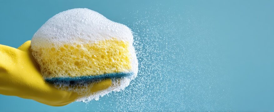 Smiling woman demonstrating home cleaning service with gloves and sponge