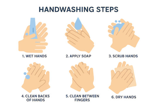 Illustrated guide demonstrating the six essential steps for proper handwashing technique.