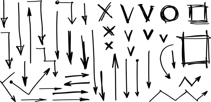 Blue pen arrow collection on checkered paper sheet. Hand drawn crayon various arrows, curved, wavy and straight lines. Direction pointers for notes, doodle and school design. Playful emphasis elements