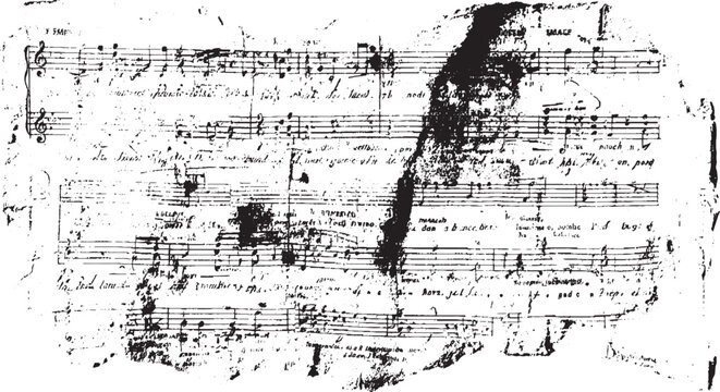 Old vintage sheet music with handwritten musical notes, annotations, and a yellowed paper background showing signs of aging and stains