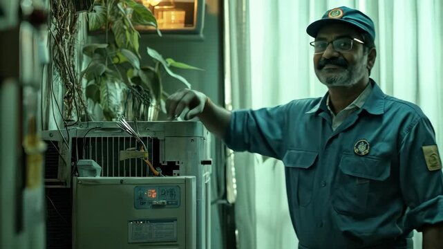 focused indian technician repairing indoor air conditioner. skilled handyman in uniform works on appliance. concept of hvac service, maintenance, and home repair.