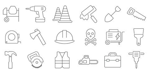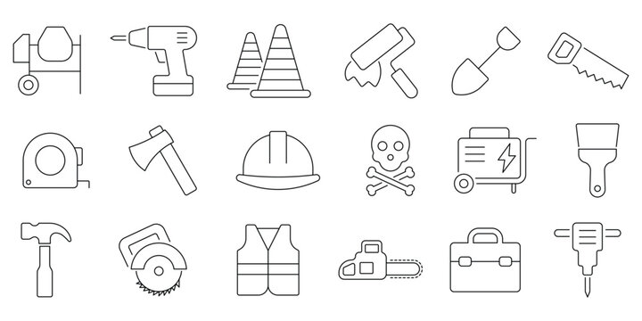 Construction tools line icon set. Comprehensive handyman and construction icon set. Containing, engineering, equipment, helmet, tool, builder, labour day and more icons. Vector illustration.