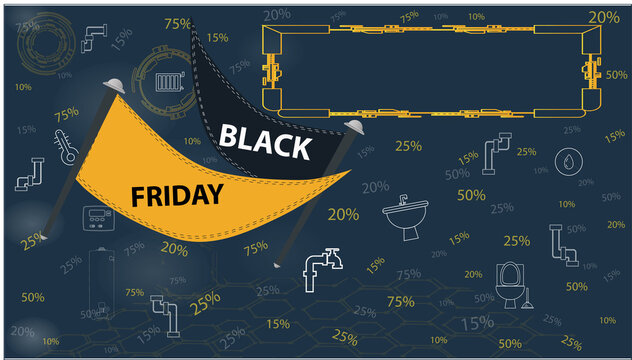 Plumbing black Friday offer with ​ tools icons, promotion of  price reduction on black background. copy-space