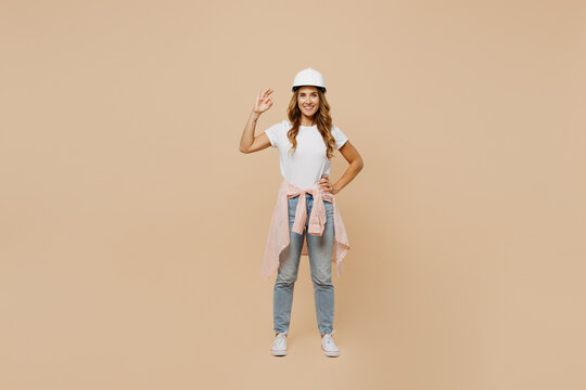 Full body young satisfied happy employee laborer handyman woman wears white t-shirt helmet show ok isolated on plain beige background Instruments accessories for renovation room Repair home concept.