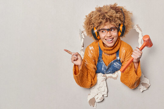 Positive handywoman holds hammer points aside on copy space shows place for your advertisement repairs wall in house wears headphones transparent eyeglasses orange jumper being best repairer ever