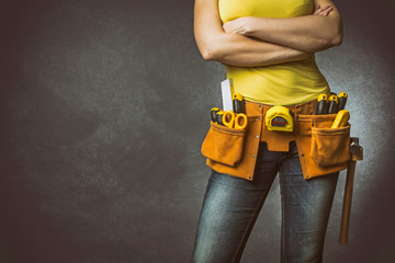 Handywoman with folded arms and tool belt on concrete background.