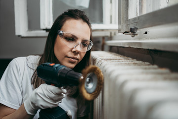 Beautiful and diligent middle age handywoman renovating her old home or apartment. She is holding professional grinder and brushing radiator for later painting. Do it yourself housework concept.