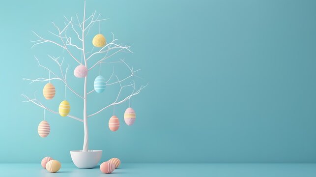 3D render of An Easter egg tree decorated with hanging eggs on a pastel blue background, clean background, no copyrighted logo, no letters, no peaple
