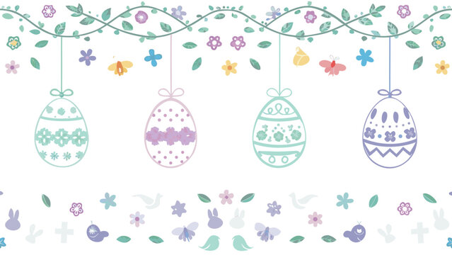 Whimsical easter egg garland with hanging decorations and a decorative border of flowers butterflies and bunnies in pastel colors