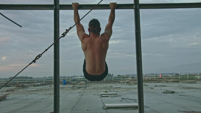 Man does hanging leg raise on rooftop exercise facility