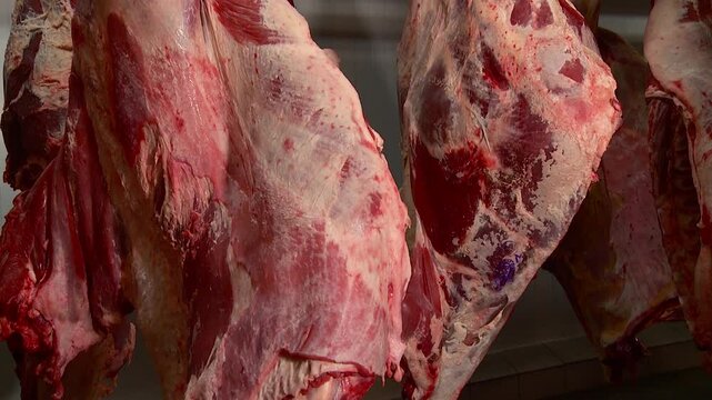 Freshly slaughtered halves of cattle hanging on the hooks in a refrigerator room of a meat plant for further food processing.