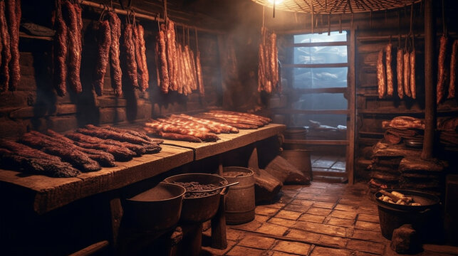 Traditional food. Smoked sausuages in smokehouse., Generative AI.