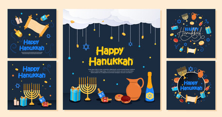 Hanukkah posters collection. Set of graphic elements for website. Traditional Jewish holiday. Religious festive of lights concept. Cartoon flat vector illustrations isolated on white background