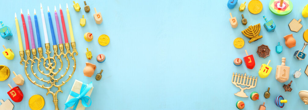 religion image of jewish holiday Hanukkah background with menorah (traditional candelabra) and spinning top