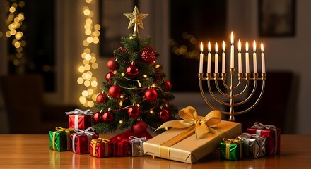 Photo of a festive scene combining a decorated christmas tree with ornaments and gifts, alongside a lit hanukkah menorah, symbolizing the convergence of holiday celebrations