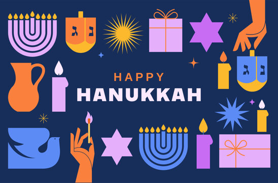 Happy Hanukkah banner, background, poster. Modern design for traditional holiday. Menorah, dove, candles and dreidel illustrations
