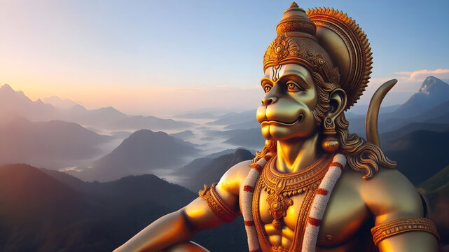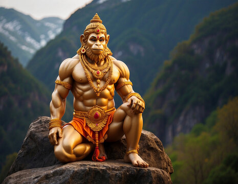 Hanuman Jayanti concept god Hanuman golden sculpture sitting on a rock scene