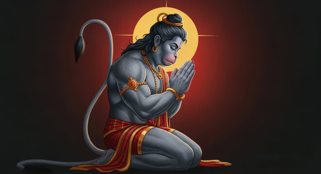 Ai generated image of hanuman kneels in prayer with hands clasped