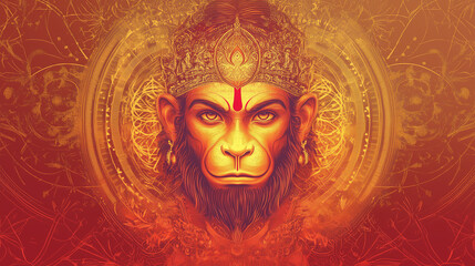 Hanuman Jayanti Banner features the face of wise Hanuman with golden light aura around him, background is a traditional Indian pattern with red and gold colors, Ai generated images
