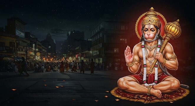 A powerful and dynamic image of Lord Hanuman, the revered Hindu deity known for his strength, devotion, and courage