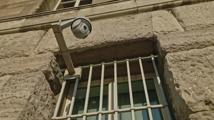 Police scene do not cross sign on the window of a store where murder thief has took place - reflection of blue siren lights defocused in the window yellow light sun flare over the scene