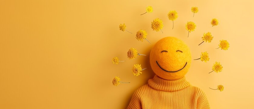 Yellow smiley face in a cozy sweater surrounded by flowers on a vibrant yellow background, symbolizing happiness and positivity.