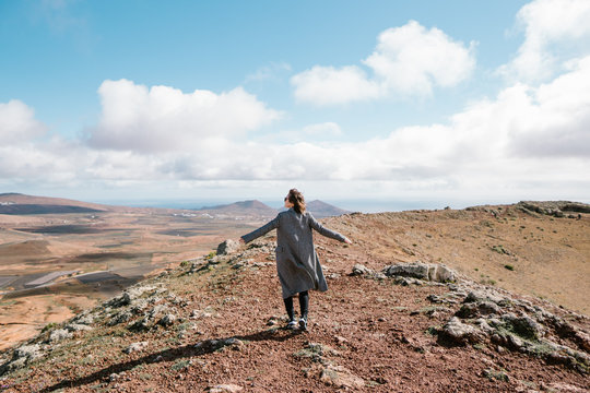Woman in coat standing in picturesque valley