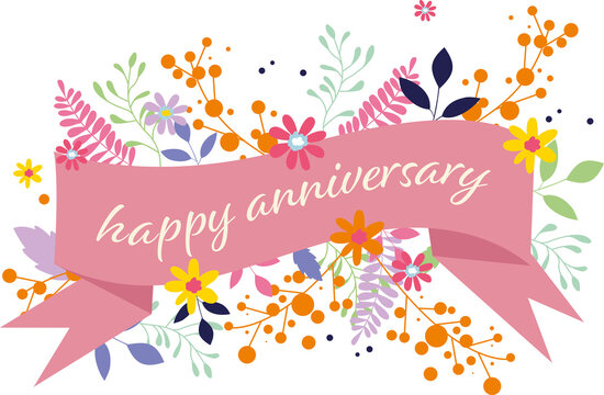 Digital png illustration of flowers with happy anniversary text on transparent background