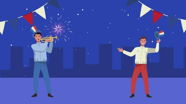 Banner 14 july bastille day in france, template with french colorful fireworks on dark sky background. French national holiday. Fireworks france flag. Vector. Translation: Happy National Day July 14