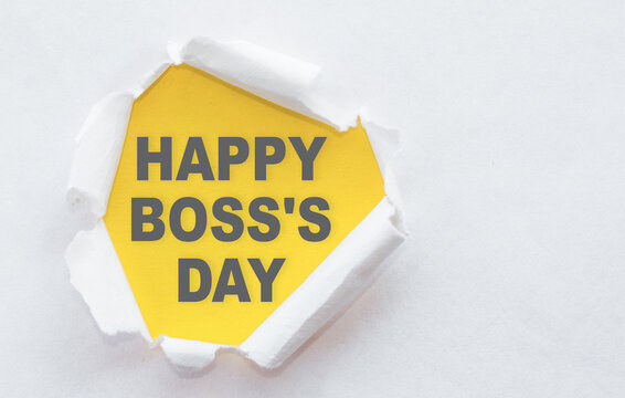 Happy Boss Day inscription appears on yellow background under torn white paper.