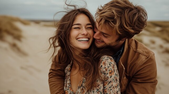 A couple is hugging on a beach, with the man wearing a brown jacket