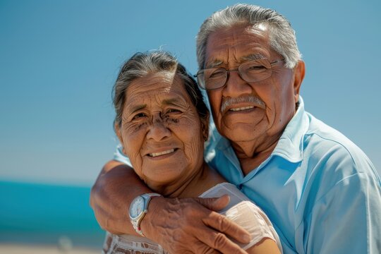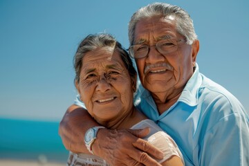 Senior couple embracing joyfully at the beach, enjoying love and relaxation during their summer holiday, creating happy memories together under the warm sun
