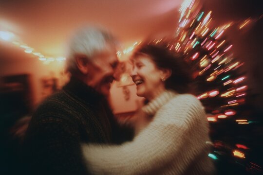 An elderly couple joyfully embraces in a festive setting with colorful holiday lights, conveying love and celebration.