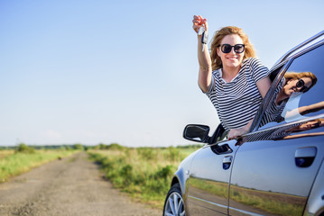 Close up woman hand receiving car remote control from auto dealer rental shop.