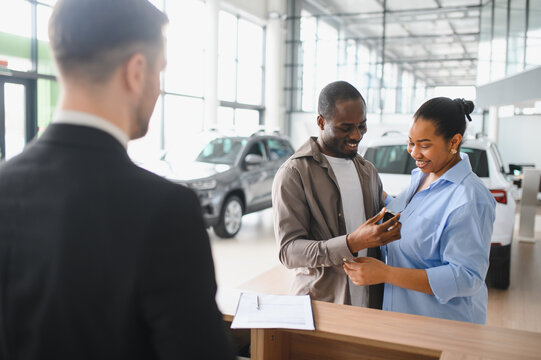 Happy Multiracial Couple Receiving New Car Keys from Saleswoman in Showroom