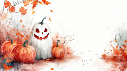 happy halloween greeting cards , white ghosts on white background with text space and orange pumpkins and autumn tree leaves on borders of white abstract background.