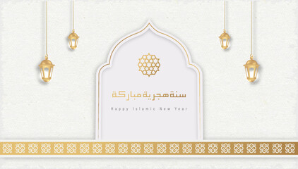 Translation:Happy Islamic New Year 1444.Islamic Greeting Card Concept with Arabic Lantern Design Vector Illustration. Happy New Hijri Year with Calligraphy  Template. Happy Muharram Poster. Ashura Day